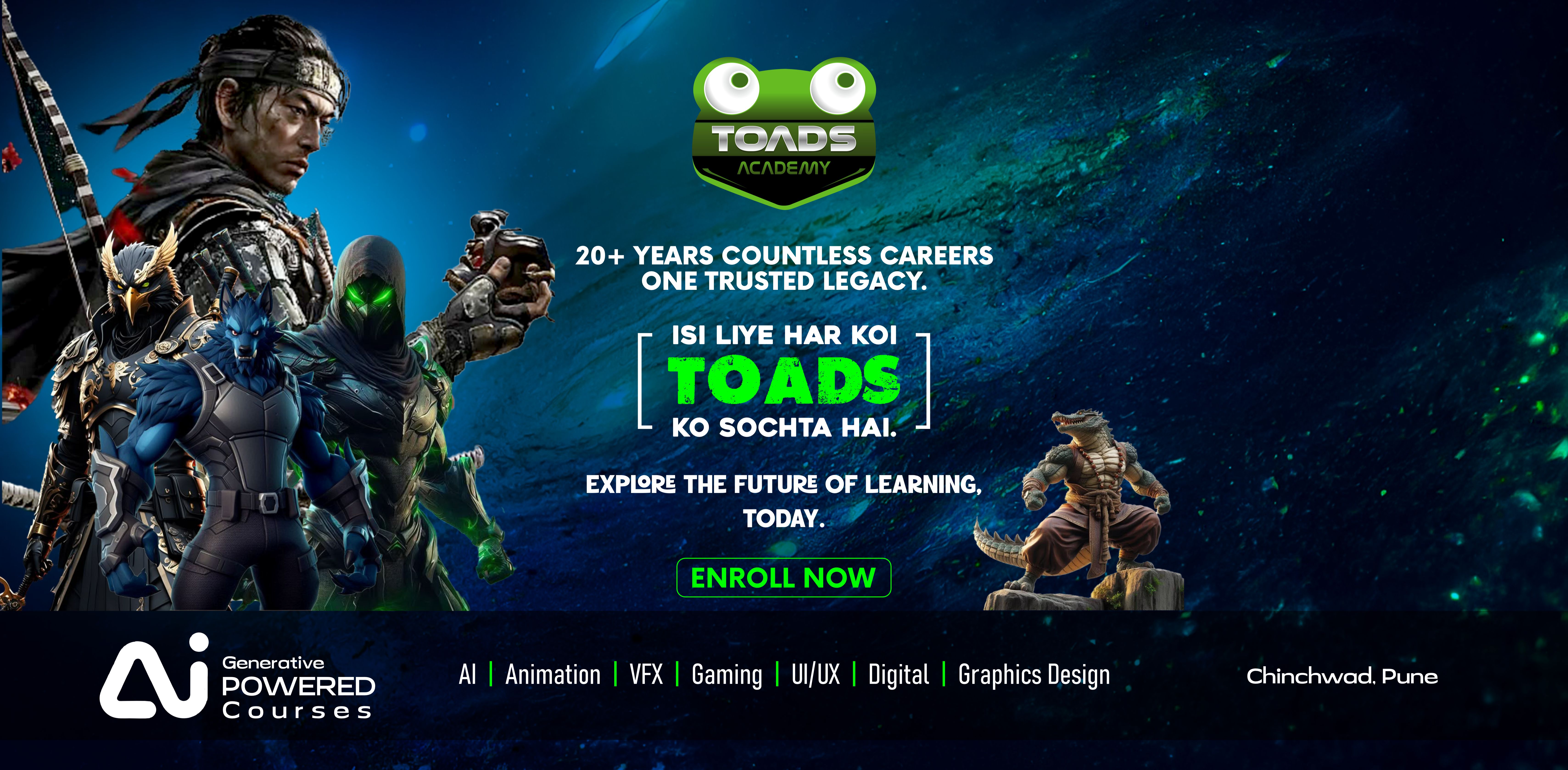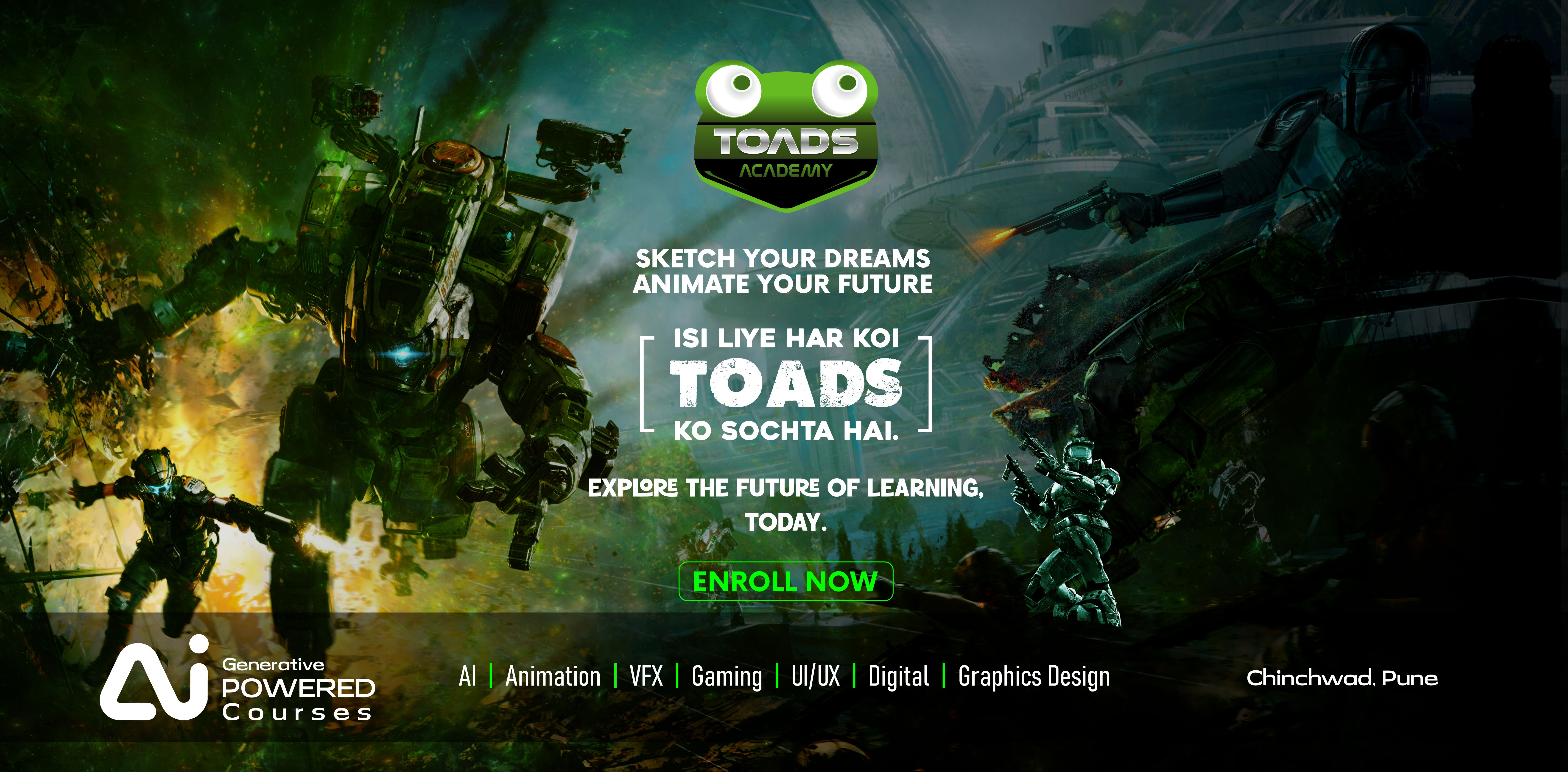 Unlock Your Creative Future at Toads Academy Welcome to Toads Academy — where passion meets purpose and creativity finds its voice. As the educational wing of Flying Toads, one of India’s most respected VFX studios with over two decades of industry leadership, we offer more than just education — we offer transformation. Whether you dream of mastering Animation, VFX, Game Development, or diving into the possibilities of Generative AI, Toads Academy is your launchpad. Our immersive, hands-on learning model is guided by industry veterans who mentor students to thrive in today’s fast-paced creative industries. Blending artistic excellence with the latest technologies, we’re here to unlock your full potential and shape you into the creative professional the future is waiting for.