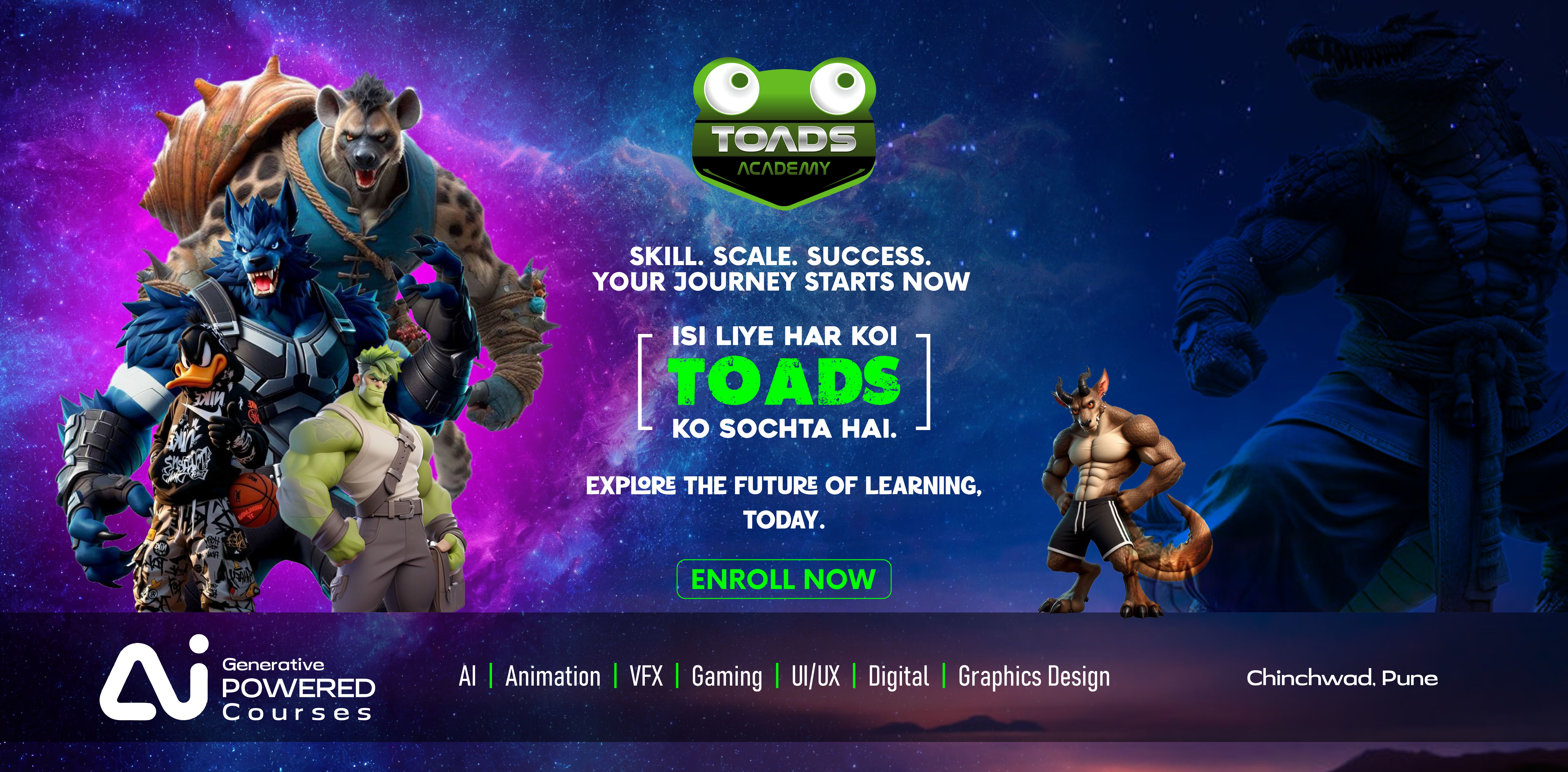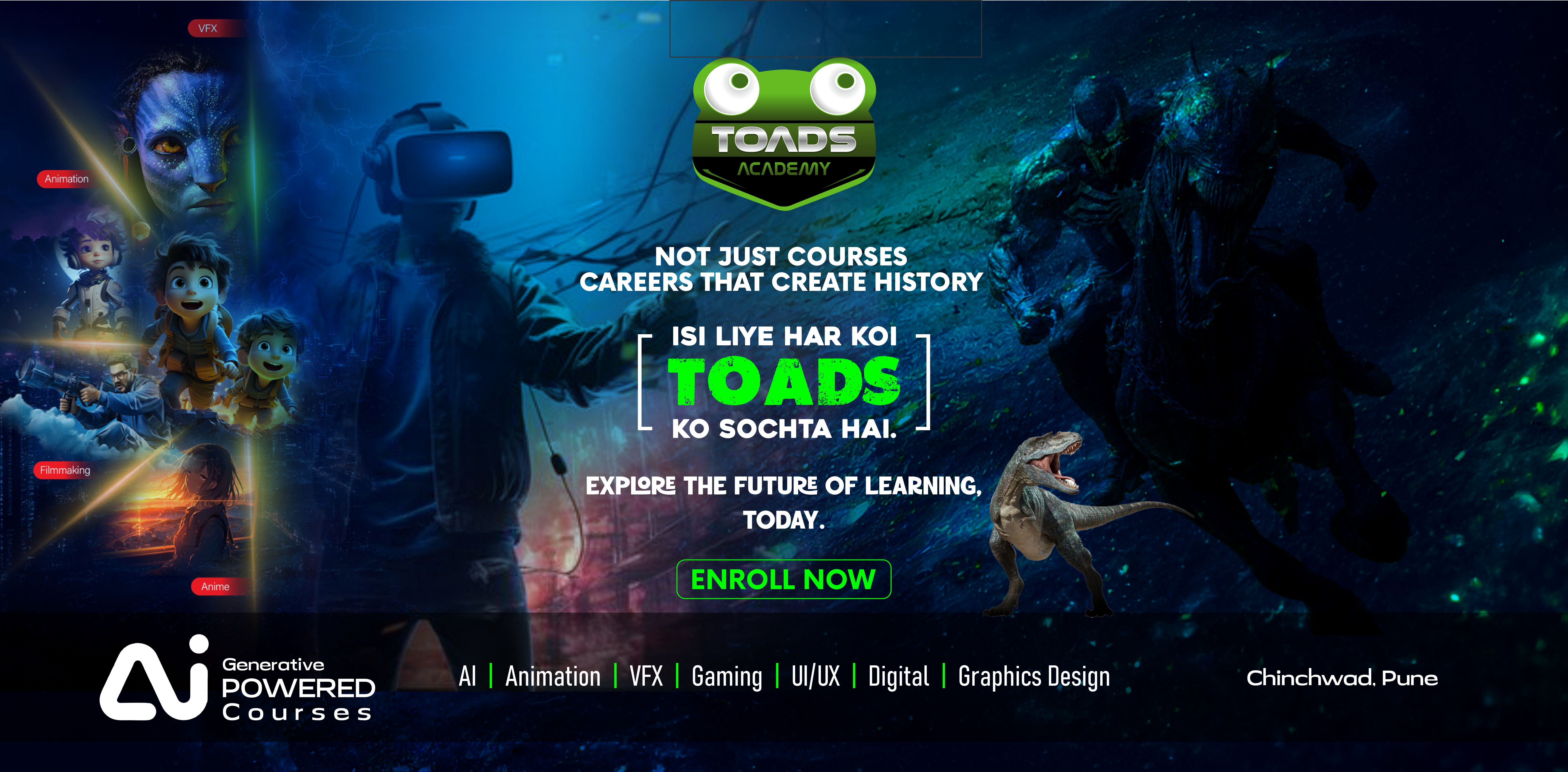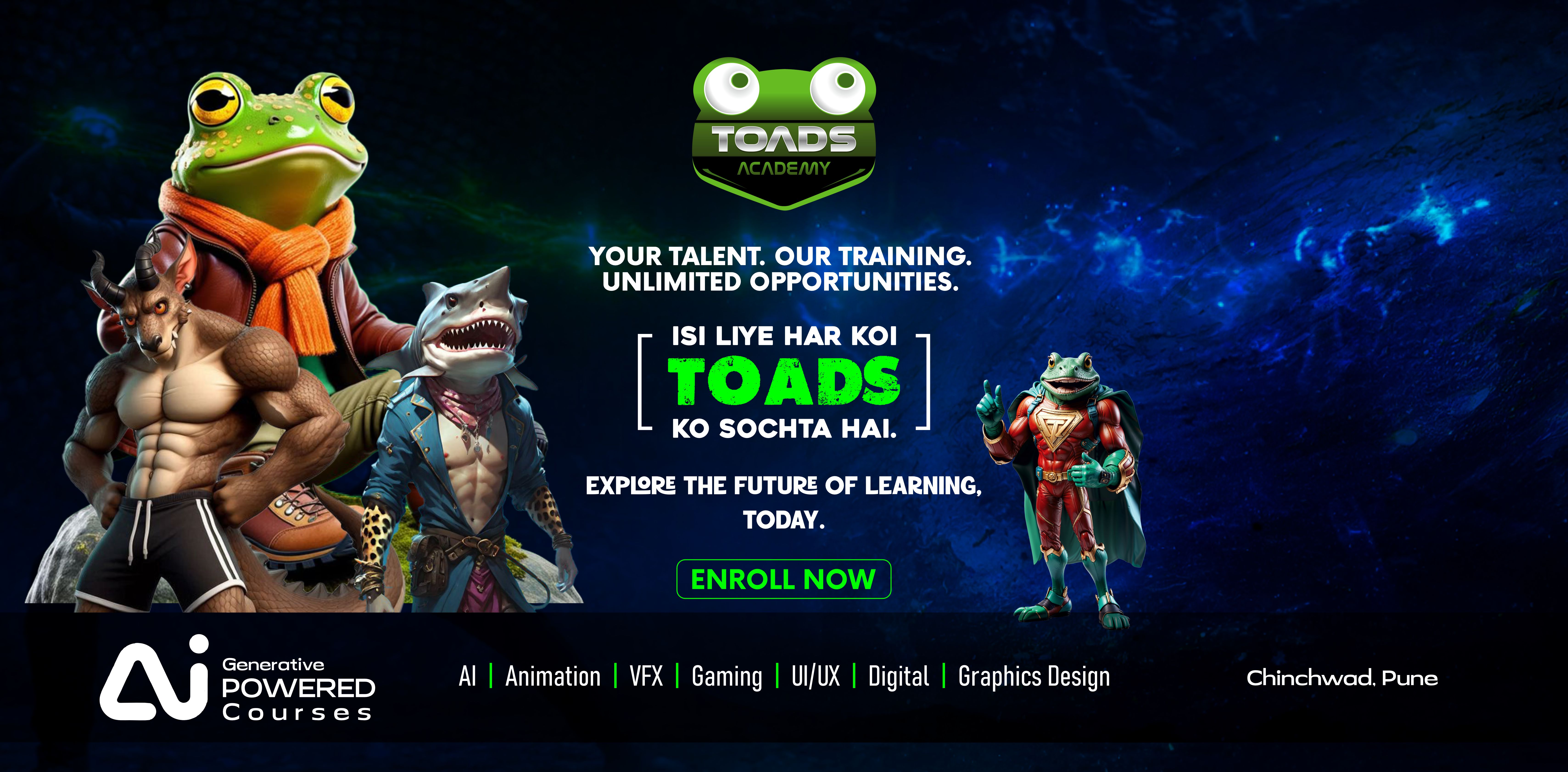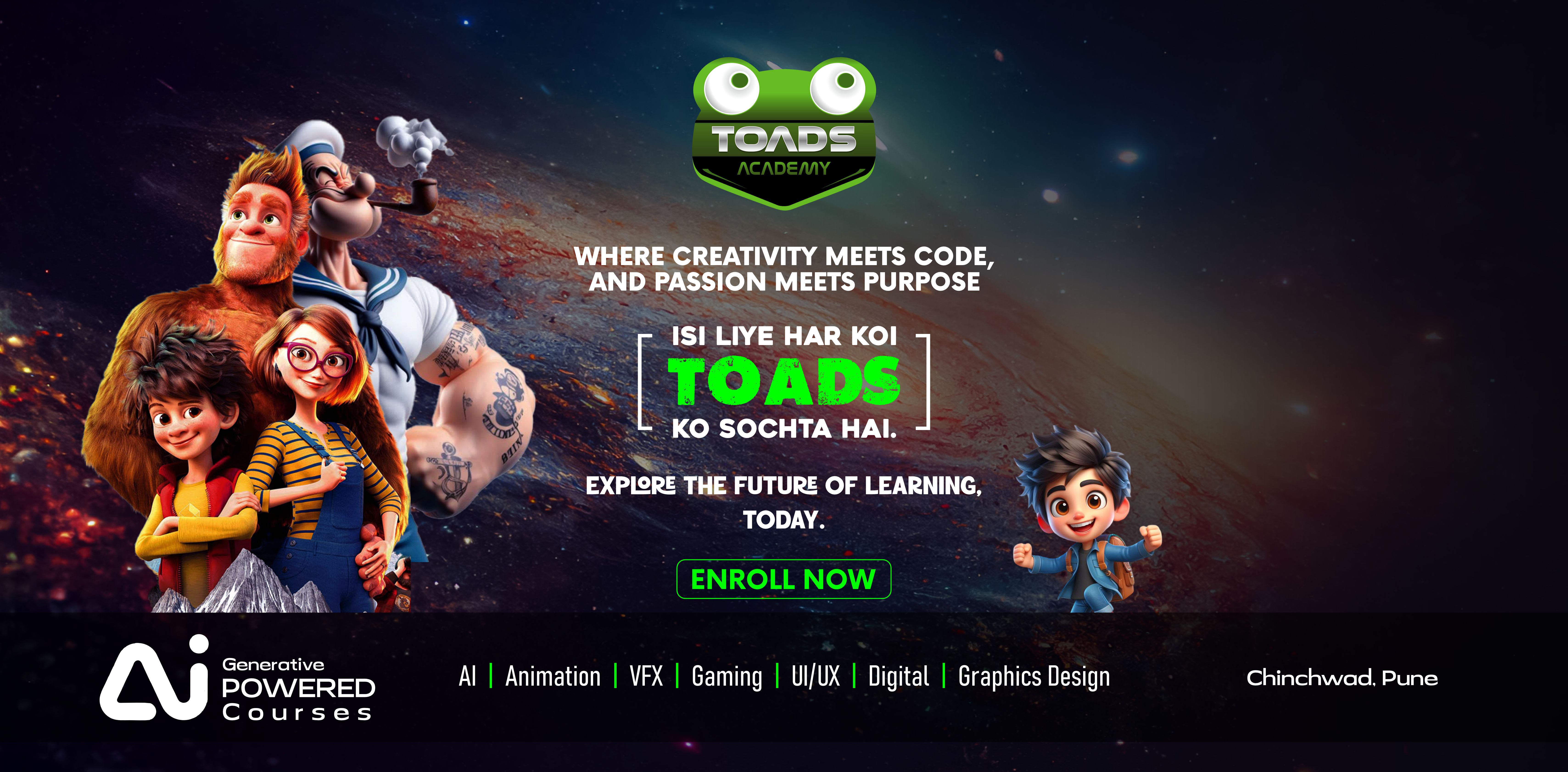 At Toads Academy, we don’t just teach — we prepare our students for the future. With cutting-edge technologies, industry collaborations, and hands-on experiences, we offer a learning journey like no other. Here’s why Toads is the ultimate destination for aspiring artists and creatives: